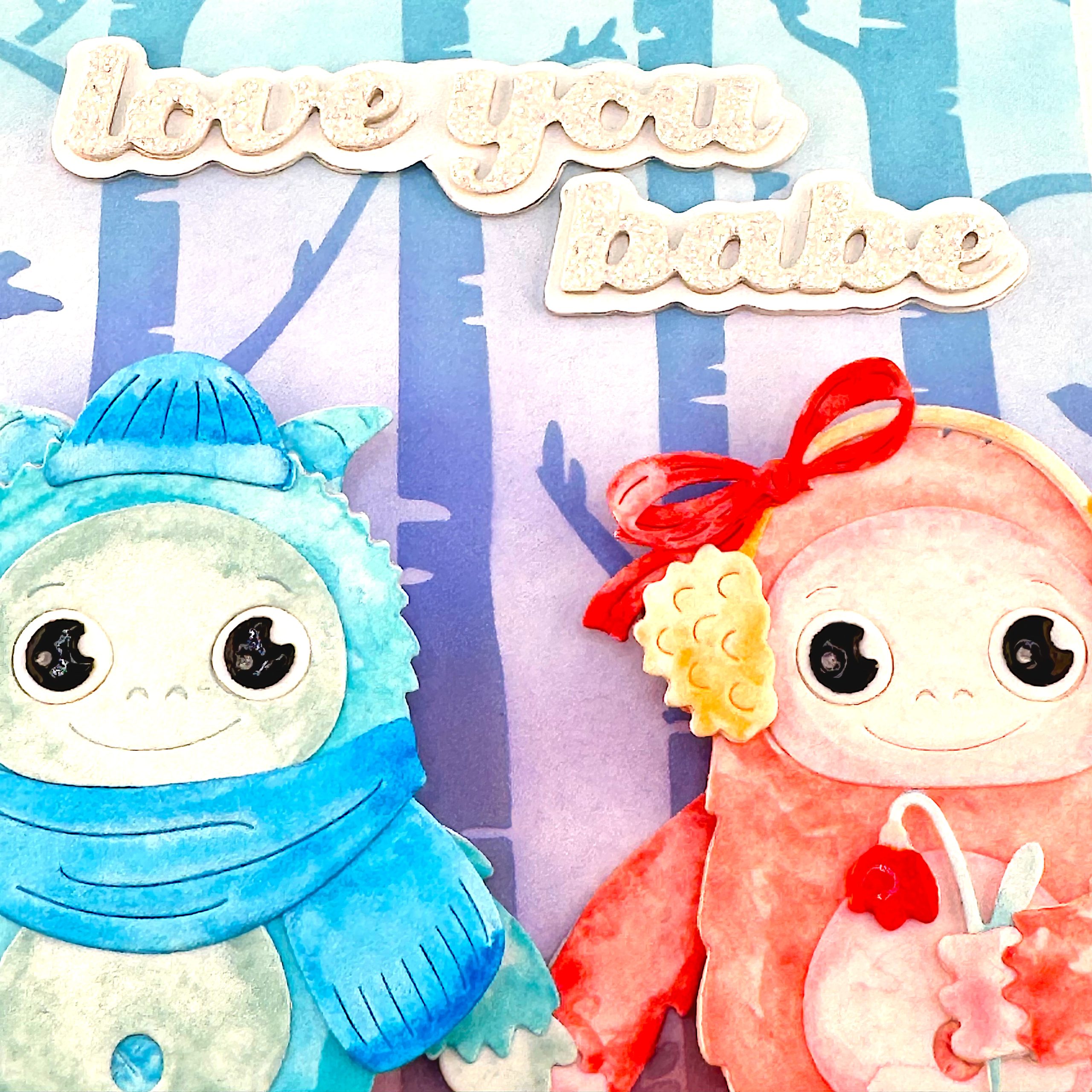 I cut all the parts out of watercolor paper and colored one yeti in blue tones and one in coral. The blue yeti makes use of the horns, the beanie and the scarf. The warm toned yeti wears fuzzy ear muffs with a bow and holds a flower in her paw. The two yetis hold paws.