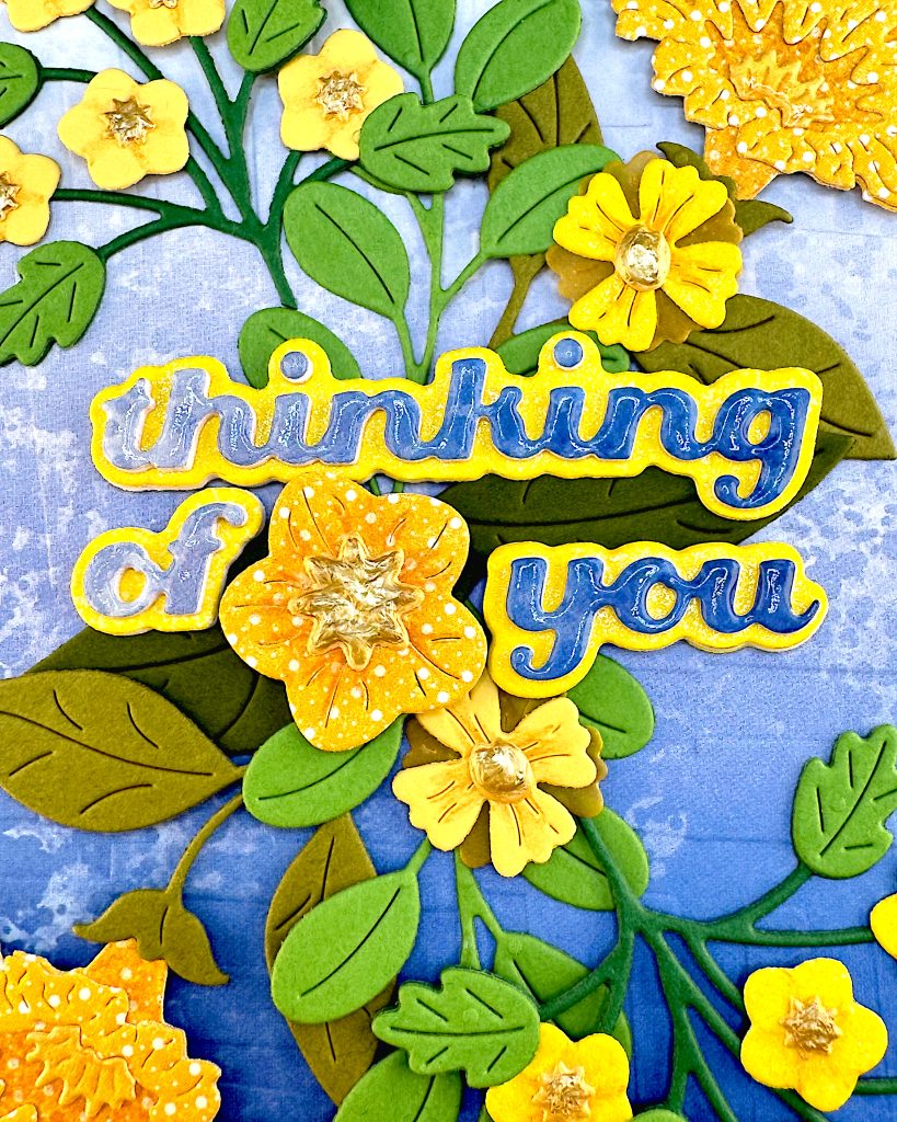 When I felt I had enough die cuts to visually separate the sentiment from the background, I glued it in place. I tried to place the “of” left -aligned with “thinking,” and “you” right-aligned with it. Then I placed a flower in the gap. I think the “you” should have been a little bit higher.
