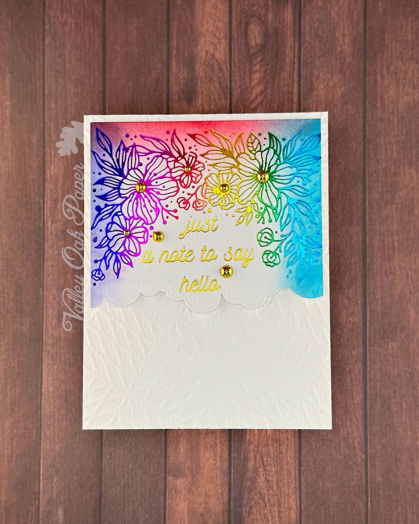 The first card I created is using one of my very first attempts at hot foiling. I had just gotten my Spellbinders Glimmer machine. In fact I used the Glimmer plate that came with the machine. The rainbow and gold foils also came with the machine. Hot foiling has a bit of a learning curve and this panel got over-foiled pretty badly. I tried erasing it, even using a sand eraser, but I still wasn’t happy with the result. So I threw it in my Box of Backgrounds.