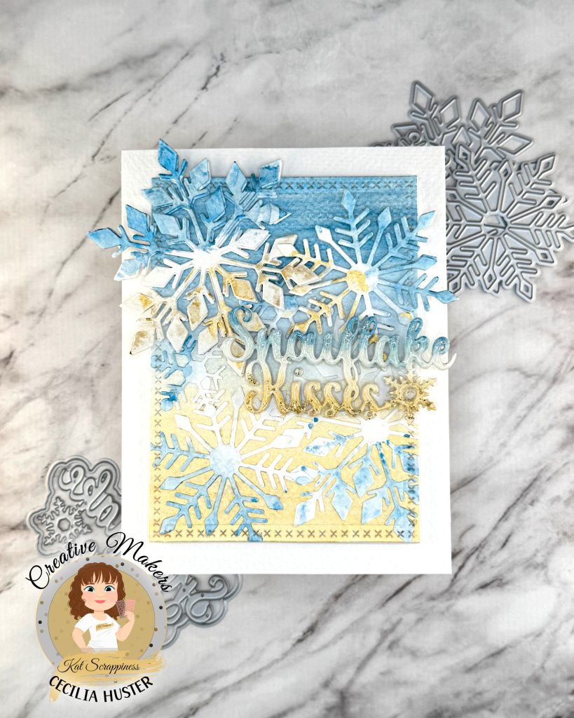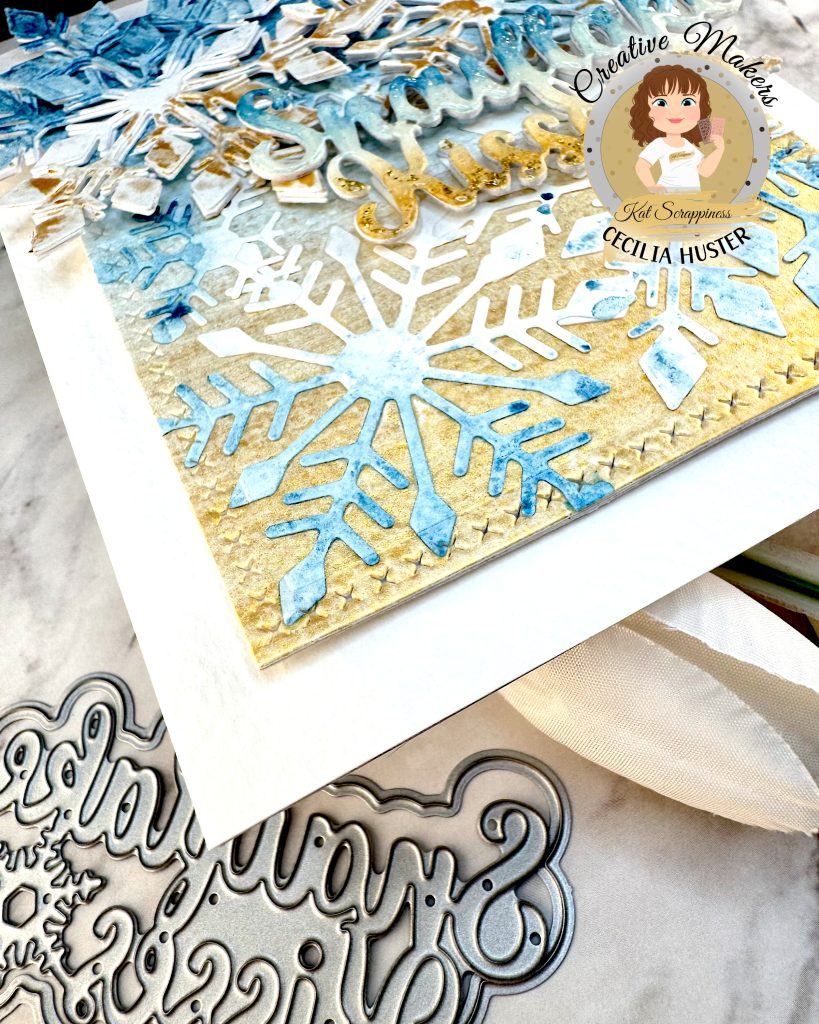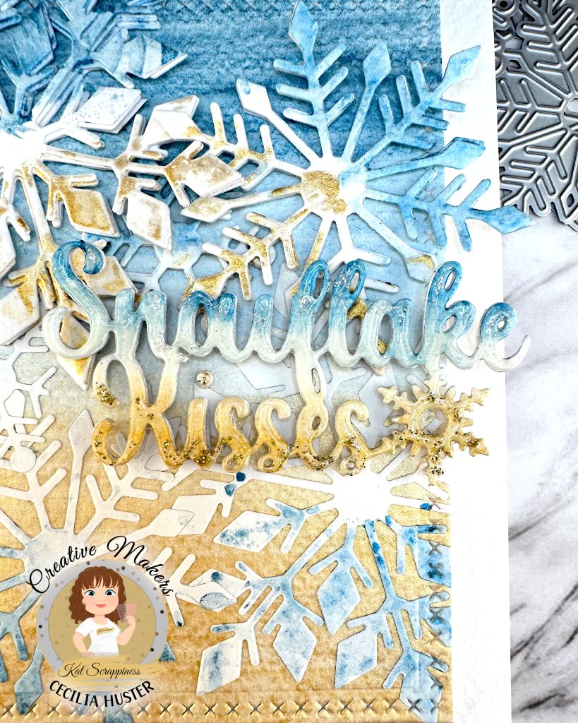 I created a smaller watercolor panel in the same blue and gold colors for the sentiment. When it was dry, I die cut it using Kat Scrappiness Snowflake Kisses Shadow Sentiment Die Set. I also cut two more with the same die set from Accent Opaque.