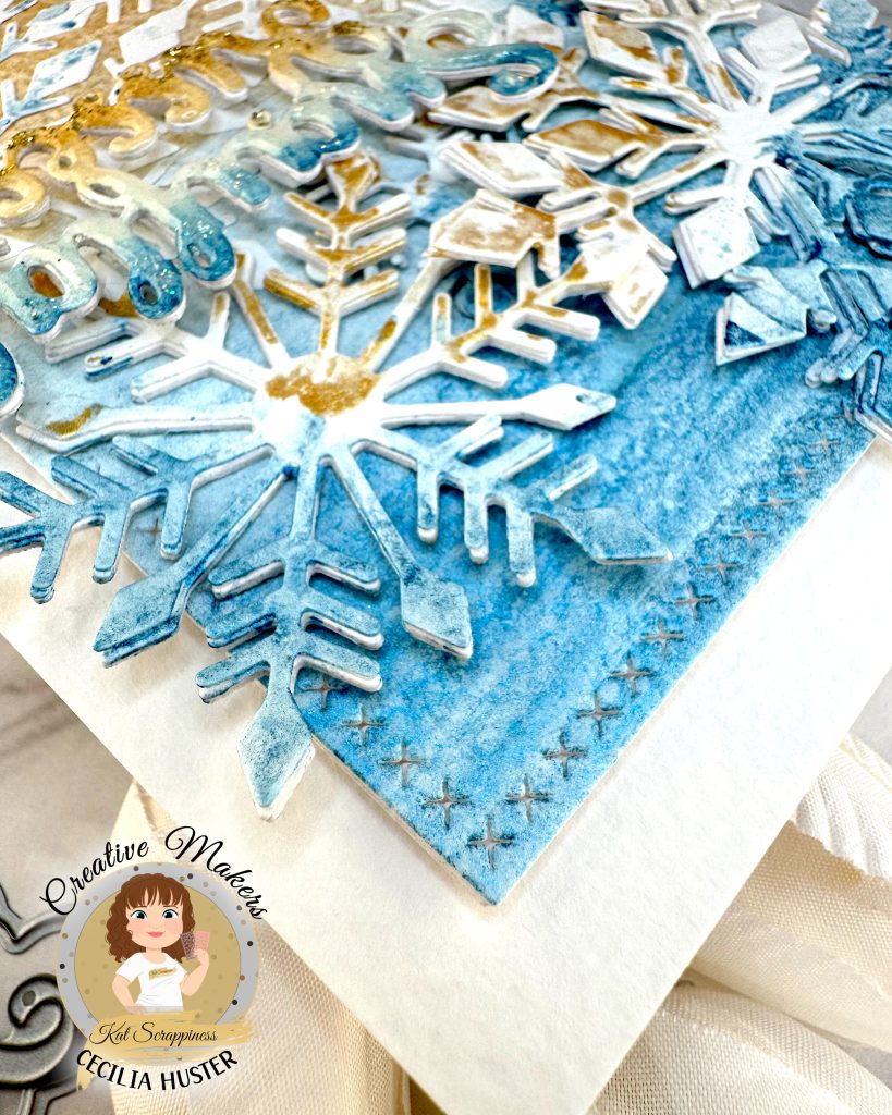 The other set of snowflakes I stacked with Accent Opaque. Then I watercolored them half and half with Kat Scrappiness Pearl Powder in Blue and Gold.