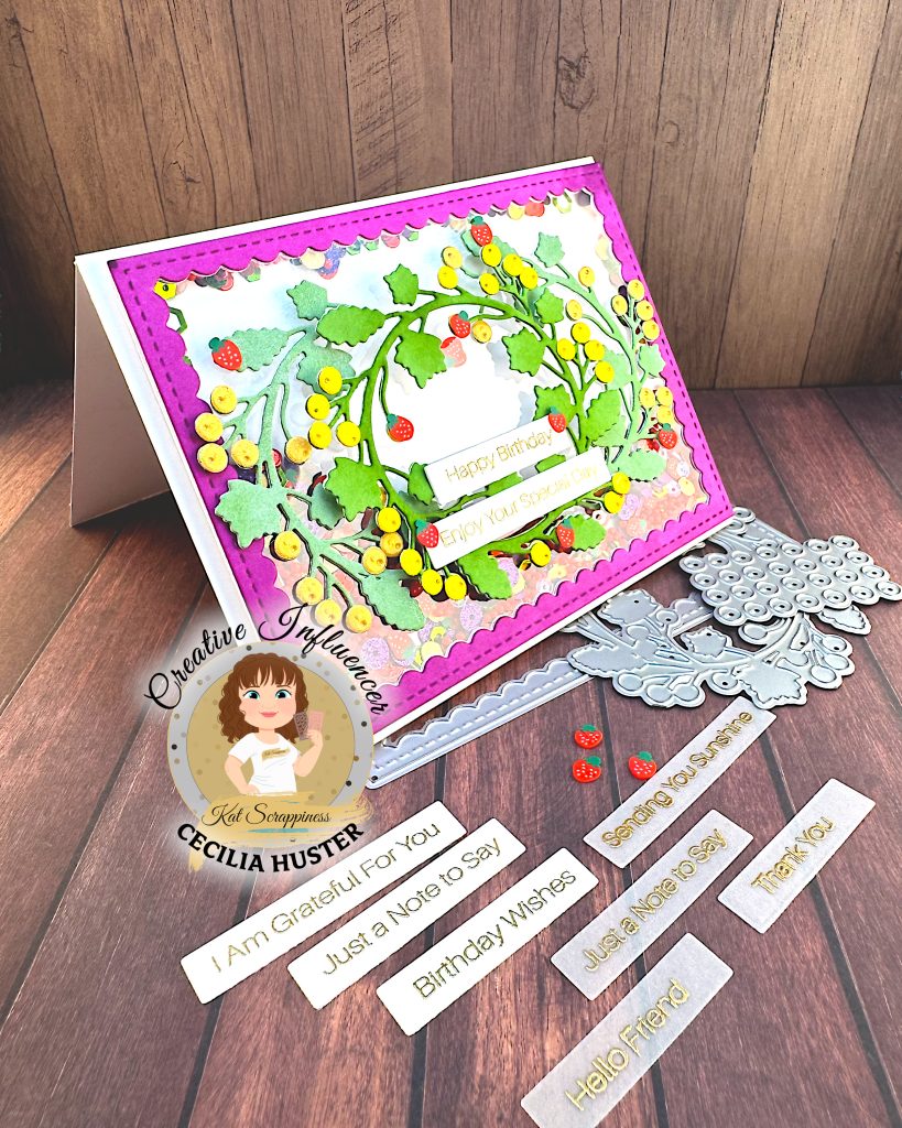I have a couple of containers with sentiments I’ve created using the Simple Sentiments – All Occasions Stamp Set and the Universal Simple Sentiments Coordinating Die. From these I selected two sentiments that are heat embossed in gold, Happy Birthday and Enjoy Your Special Day. I glued them on top of the center wreath. Finally I added some of the strawberry sprinkles I’d saved earlier.