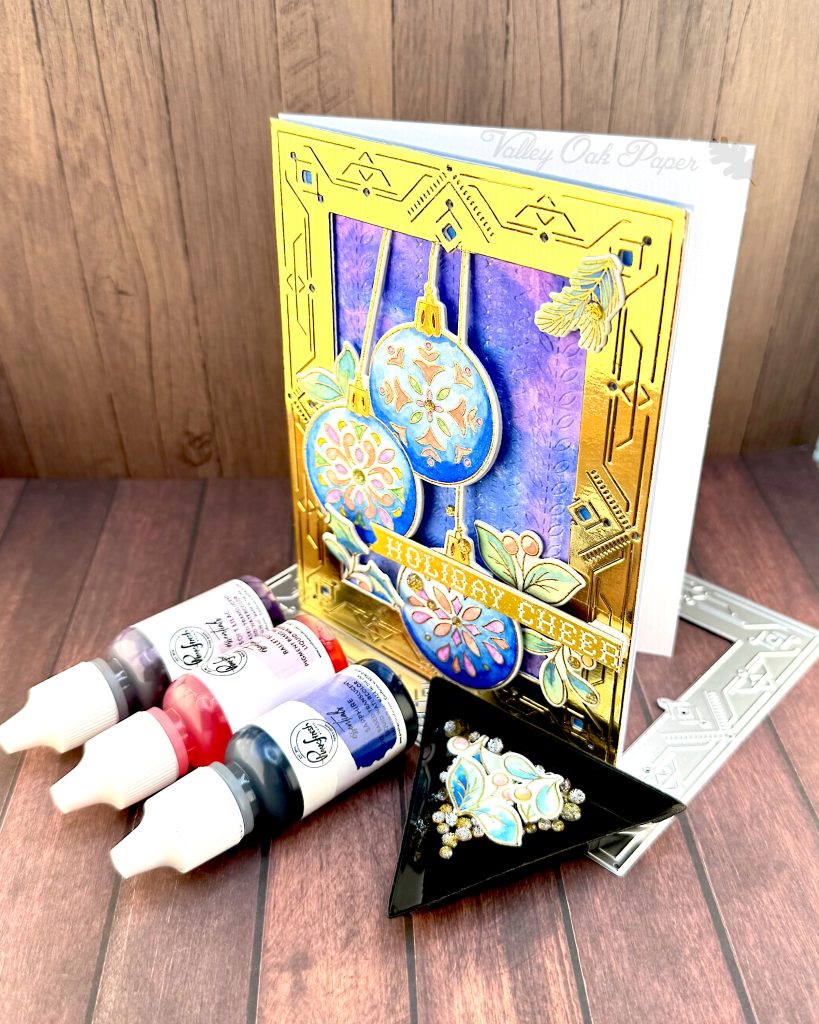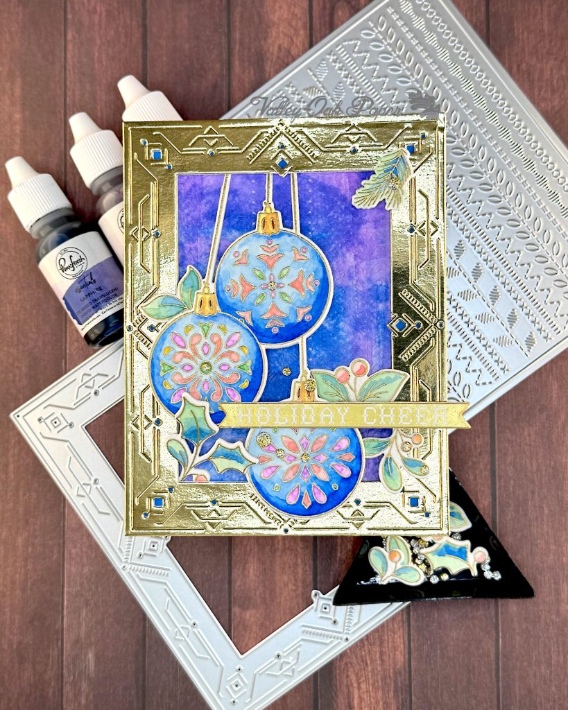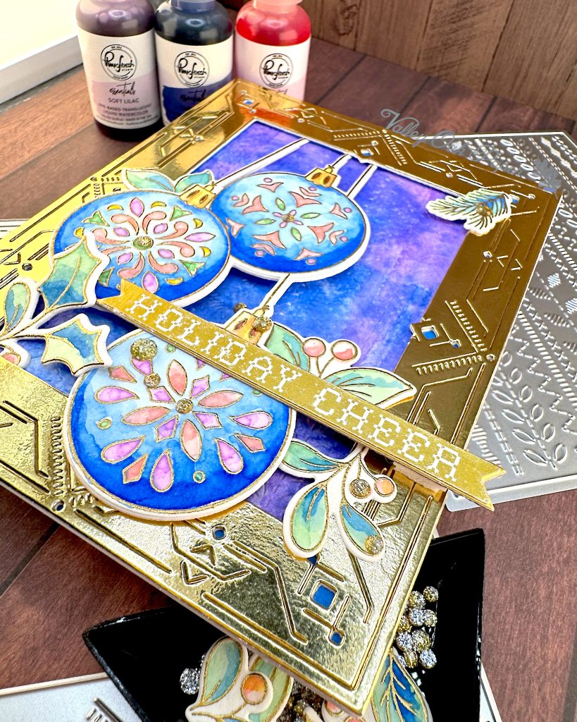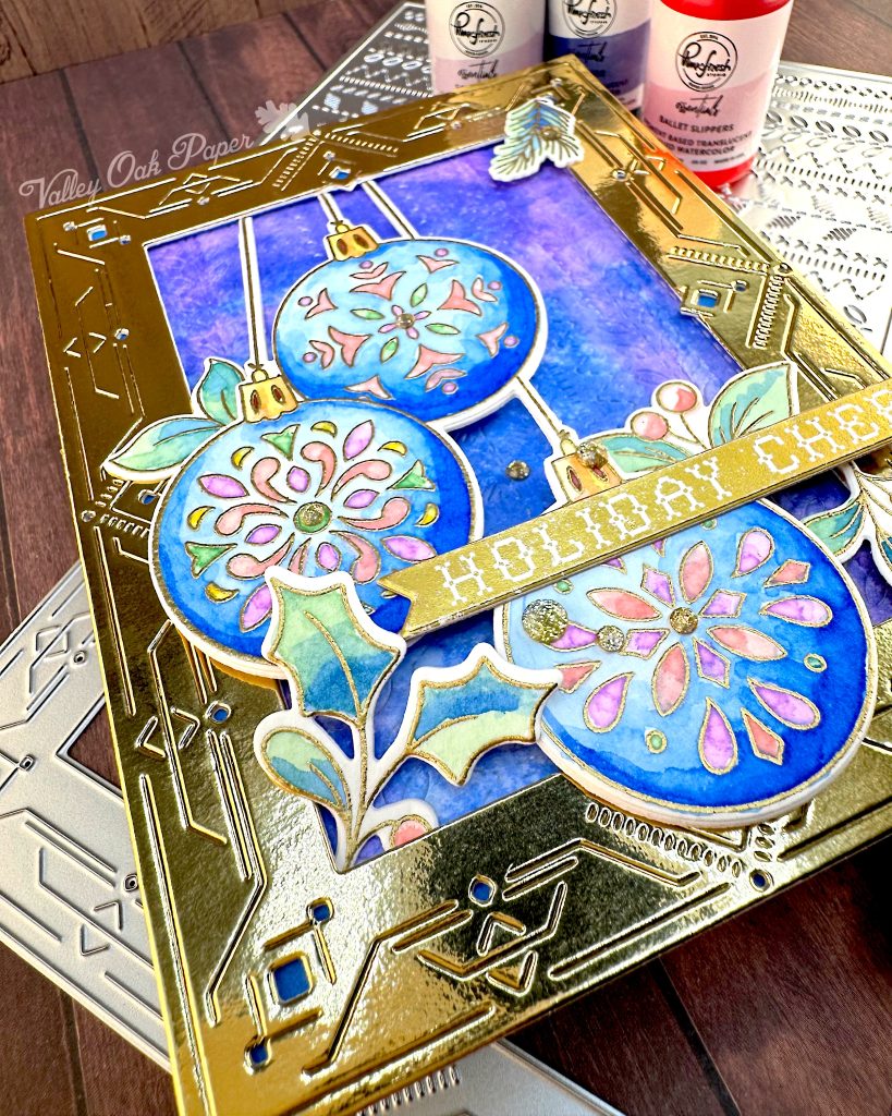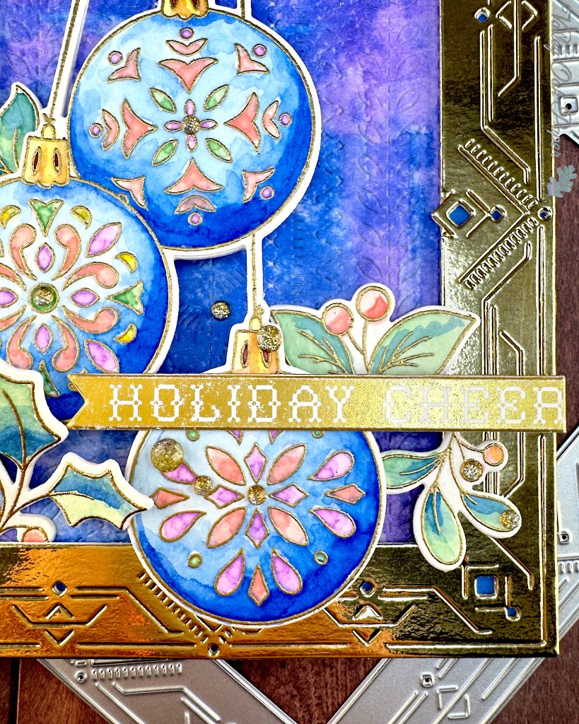 For my sentiment I went to my mug of readymade sentiments. I found one that says Holiday Cheer that was created using the Spellbinders BetterPress Plate of the Month for July 2025, Festive Press. I glued it across the lower two ornaments and propped up the end with two layers of foam tape.